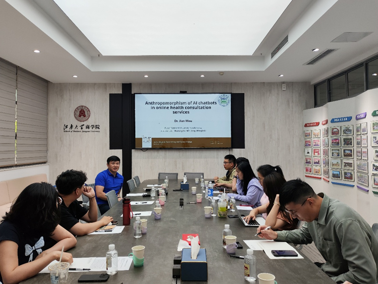 5月13日,数智组织与智融创新研究团队第三期学术活动在新葡萄8883国际官网109会议室举行。韩国釜山大学新葡萄8883国际官网牟健教授受邀作题为《人工智能聊天机器人的拟人化对用户持续使用在线健康咨询服务的影响关系研究》的学术讲座。本次讲座由新葡萄8883国际官网组织管理系主任汪长玉教授主持,学院教师和各专业研究生共计20余人参加讲座。
