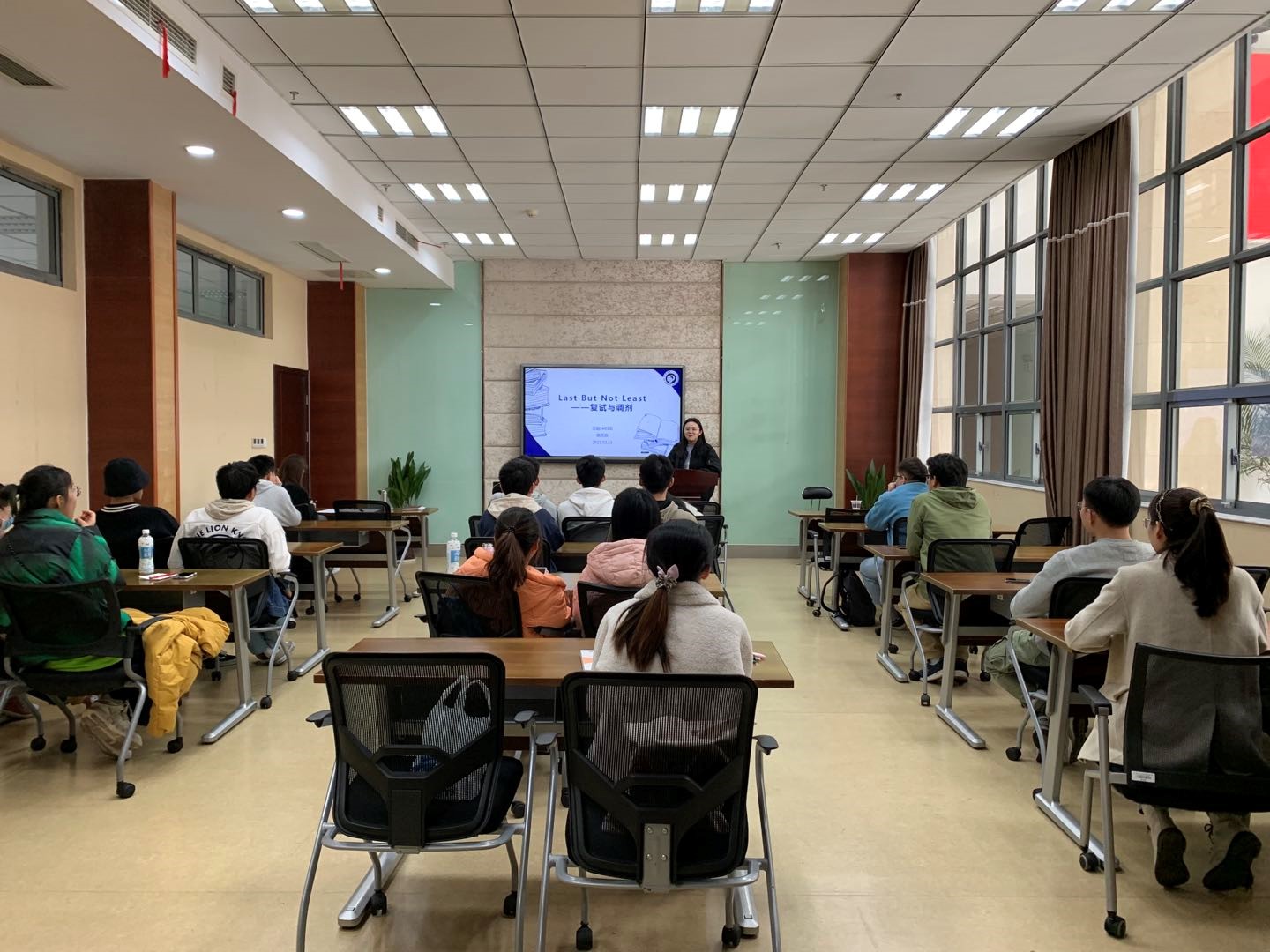 活动最后,辅导员陈梦老师对本次活动进行总结,希望各位同学都能够准确把握自己的定位,多渠道、多方面的了解复试和调剂的信息,全力以赴备考,祝愿2017级考研学子一战成“硕”。