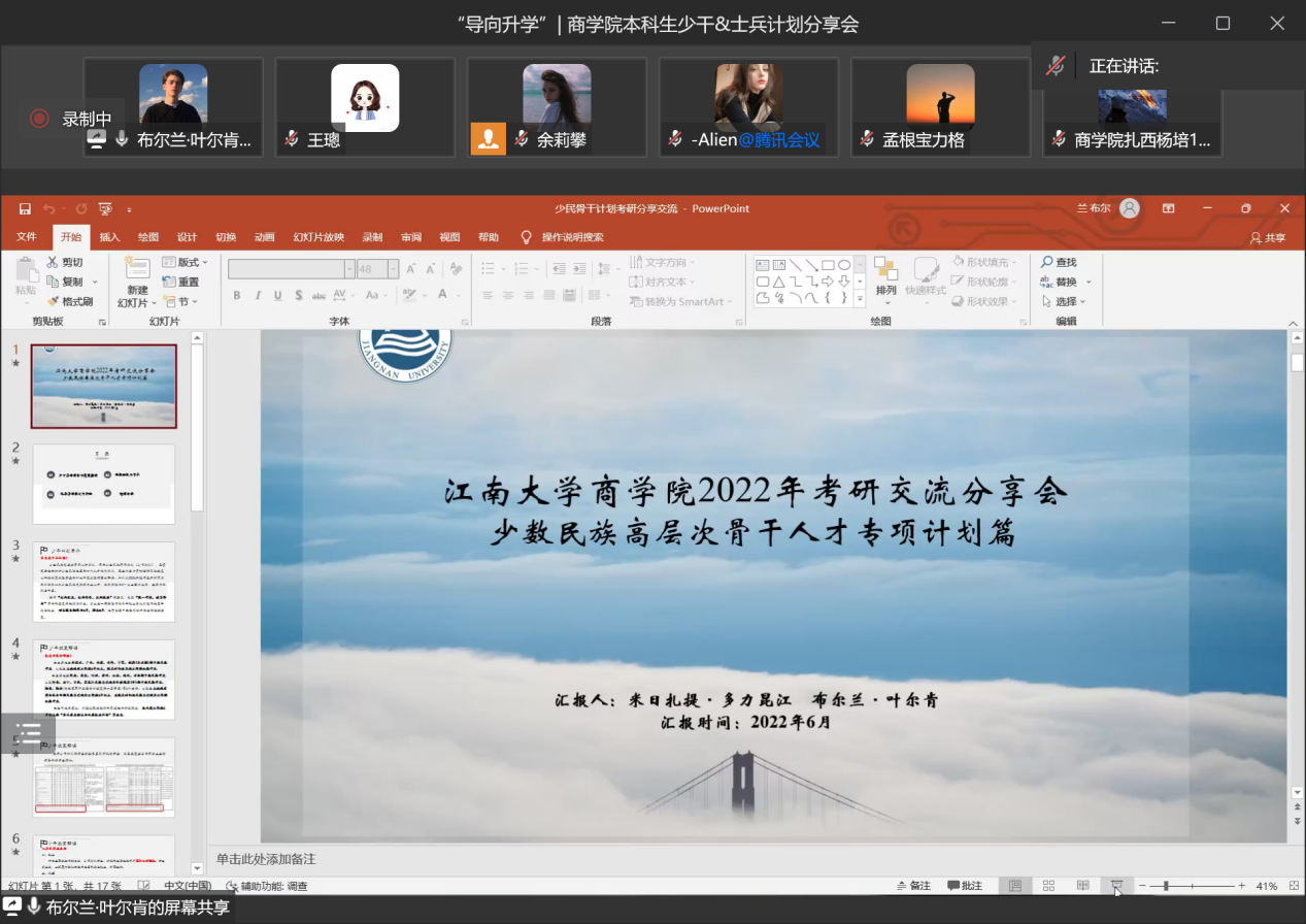 接着,三位嘉宾依次进行分享。米日扎提·多力昆江同学和布尔兰·叶尔肯同学分享了自己备考“少数民族骨干计划”的经验与心得。米日扎提·多力昆江同学从“如何选择学校专业”和“如何备考”两个方面为2022年考研的学弟学妹们做了经验分享和指导。首先,他讲到,考生确定报考学校和专业要从自身实际出发,同学们要根据自己未来职业规划、目前的学习成绩和复习效率,考虑是否要报考本校、是否跨专业、是否尝试保研等。其次,他还对考试内容和形式作了介绍,鼓励同学们确定明确清晰、能够实现的考验目标,制定合理健康的备考计划。同时,他还特别提醒同学们要注意报名备考时间节点和重点事项,鼓励同学们相互合作、共同进步。最后,代表新葡萄8883国际官网往届研究生学长学姐对2023届考生表达了美好祝愿。