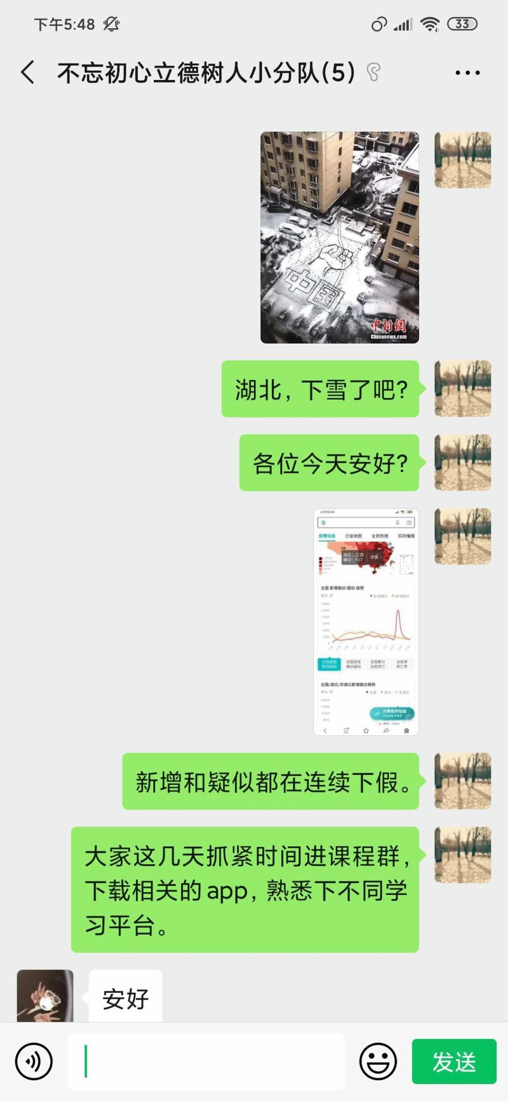 初为人父的邢新朋博士主动请愿,积极投身到帮扶湖北籍学生的活动中来。他建立起“不忘初心、立德树人”微信小分队,向学生承诺:“无论何时,大家有任何困难,都请及时通知我,我会尽最大能力帮助大家。”每一天,邢老师都传递积极的正能量,以自己的语言、自己的行动为大家减轻心理压力,坚定学习信心和战疫信心,此举激励感动着学生,被学生转发至朋友圈,收获了更多的肯定和点赞。